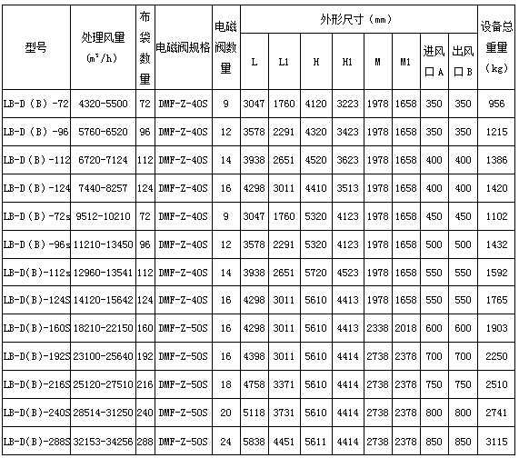 LB-DMC(B)-72s---LB-DMC(B)-288s選用布袋規(guī)格:130*2600mm