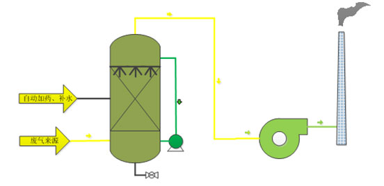 在車間將無組織排放的廢氣首先經過收集罩收集后,廢氣經過引風機作用下,引入含酸(堿)的洗滌塔吸收中和,使含酸(堿)廢氣中和后達標排放。